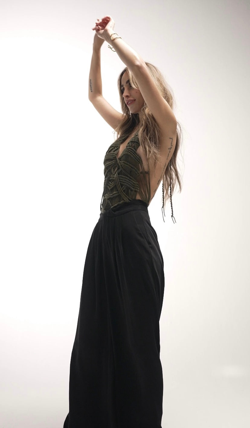 El Body Ava esta tejido en cordón de poliéster de color verde oliva, con tirantes ajustables en el cuello. Con su diseño único te hará destacar.